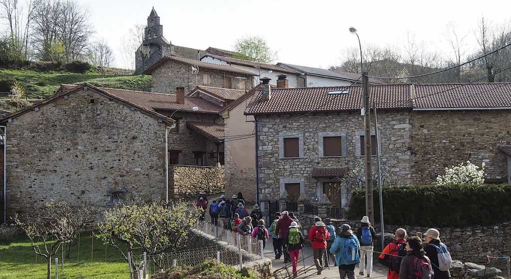 Nós comezamos a camiñar dende a área recreativa de Horcadas, pobo do concello de Riaño, aos pés do pico Gilbo, unha das montañas máis emblemáticas da comarca; unha vez acadada a igrexa, continuamos pola pista que sae xusto detrás dela que vai por unha das aproximacións máis utilizadas para a subida ao Gilbo, itinerario que percorremos durante case 3 km ata o Alto de Vallarqué, despois do Prado da Collada, e antes de baixar a Carande.