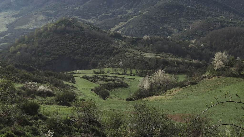 Imos cara abaixo coa estrada de Riaño aos pés, ata que a pista vira á esquerda pola carballeira para baixar ata pasar por unha pequena explotación gandeira. Paramos un anaco para falar co home que a leva, laiándose do mal que o está a pasar o gando por falta de chuvia, pois as vacas case non dan leite, téndolles que dar biberón aos xatos.