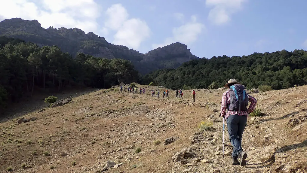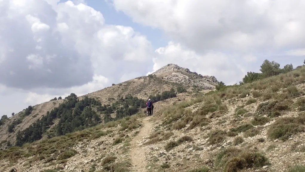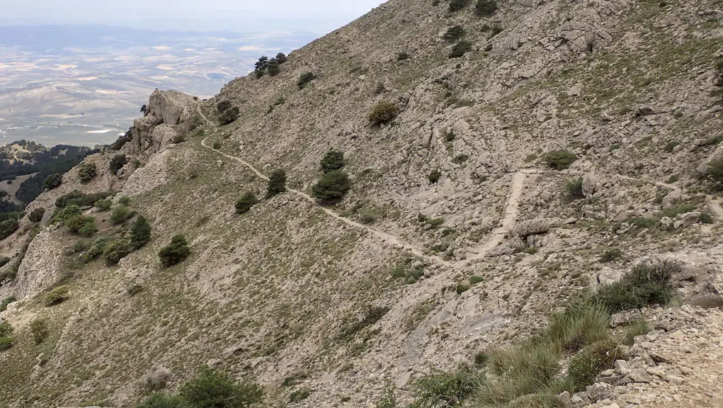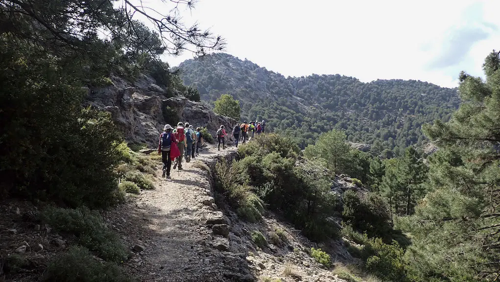 Nada máis sair, cruzamos ao arcén esquerdo da estrada que vai a Cazorla ata darmos cunhas escaleiras un tanto irregulares polas que iniciamos o ascenso, que coincide co mesmo camiño por onde baixamos cando rematamos a ruta dende o Porto de Las Palomas. Pasamos as instalacións do comezo da Vía Ferrata La Mocha, e continuamos pola vella senda de montaña das Ánimas, nun ascenso con bastante desnivel, cara ao Prado Redondo e enlazar co GR7, con dirección ao interior do parque natural.