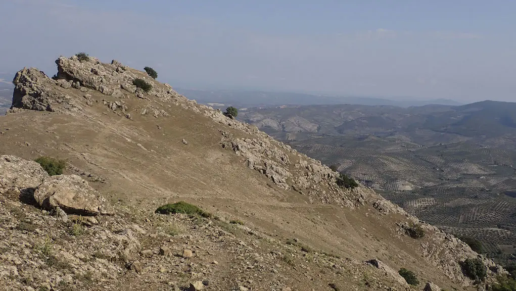 A medida que imos descendendo comodamente, volvemos alternar tramos de piñeiral con outros de vistas (non me canso de admirar este mar de oliveiras). Chegamos ao collado de Cagahierro onde decidimos facer a parada para xantar aproveitando as primeiras sombras sobre o camiño. Nesta hora da comida, a calor empeza a ser importante, pero non tan terrible como imaxinara. Coido que nestes días tivemos moita sorte coa temperatura, alta pero moi levadía, aínda que unhas nubes ameazantes comezan a facer acto de presenza obrigándonos a apurar o paso.