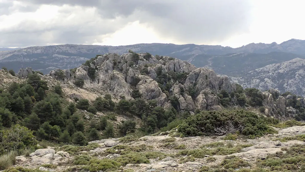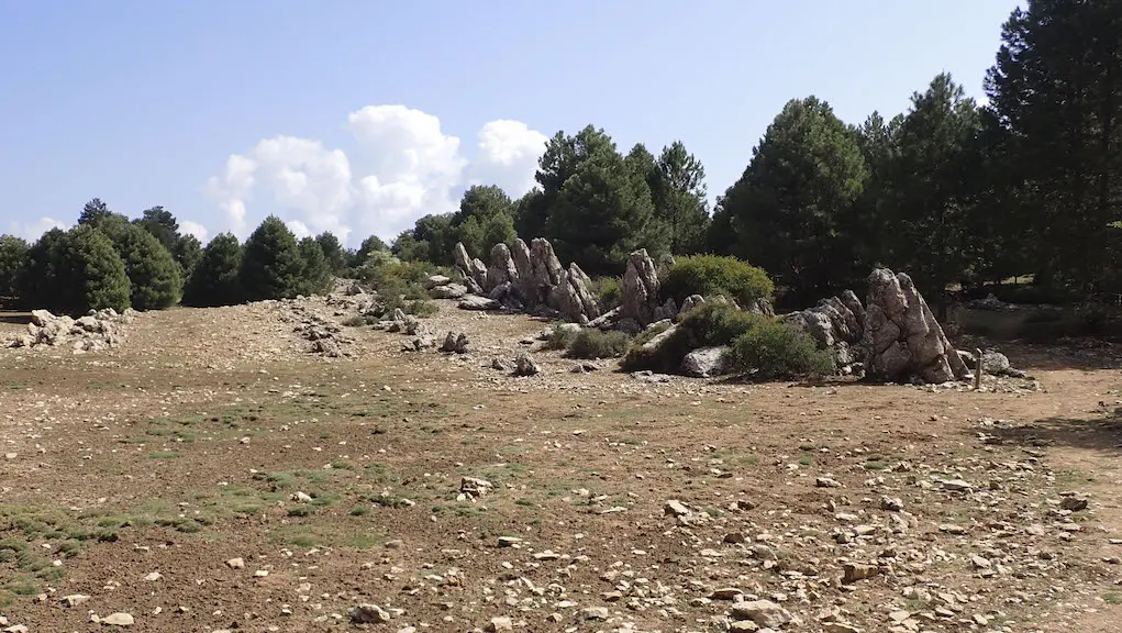 Ascendemos outra vez por piñeiral con vistas intermitentes cara ao val do Guadalquivir, ata que chegamos a llanear durante un treito e tomamos un camiño ancho con bo firme. Deseguido avanzamos por unha nava ou chan, coñecida como a Lagoa de Cazorla, aínda que hoxe non é tal, pois pode chegar a encharcarse no centro. e en cuxa marxe esquerda hai unha aliñación de rochas con perfís dentados e formas moi caprichosas. que semellan fincadas no solo.