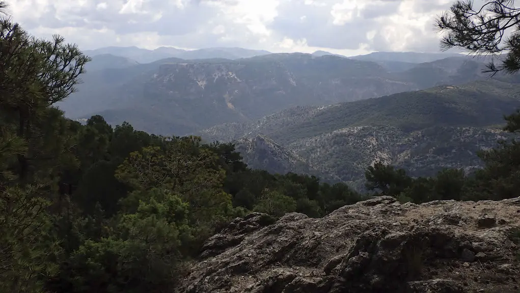 Regresamos ao camiño e xa imos ter á fronte as vistas cara a Cazorla e o castelo das Cinco Esquinas, aínda moi abaixo. A senda, que descende polas ladeiras do Cerro de Cagahierro, é panorámica nalgúns tramos. Cortamos nun par de ocasións a pista forestal, e facemos tamén unha breve parada no miradoiro de Riogazas, pois comezan a caer as primeiras pingas e non sabemos se isto vai ir a máis.