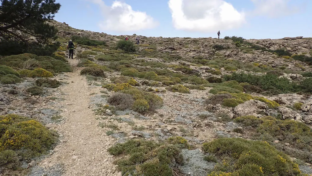 Non tardan moito en regresar e emprendemos o descenso. Pouco a pouco volvemos a Porto Gilillo e desbotamos o carreiro por onde viñemos que vai por detrás das ruínas. Este punto é un fito importante da etapa porque cambiamos de vertente e a dirección do carreiro toma a orientación cara ao sueste.