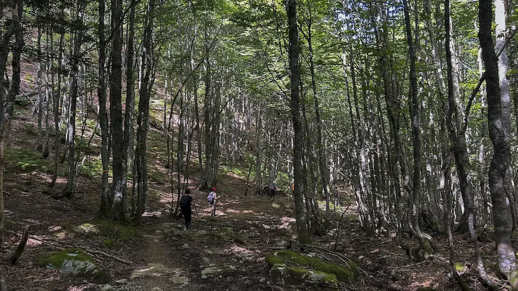 É o dominio do bosque de faias e abetos o que lle confire a este bosque o seu carácter escuro. Carteis anunciando o inicio do circuito de raquetas de inverno, ou advertencias coas accións que poidan perturbar a vida salvaxe (convén evitar berros, música, etc.), indícannos o camiño, inicialmente chan ou en lixeira subida, para atravesar esta primeira zona de bosque.
