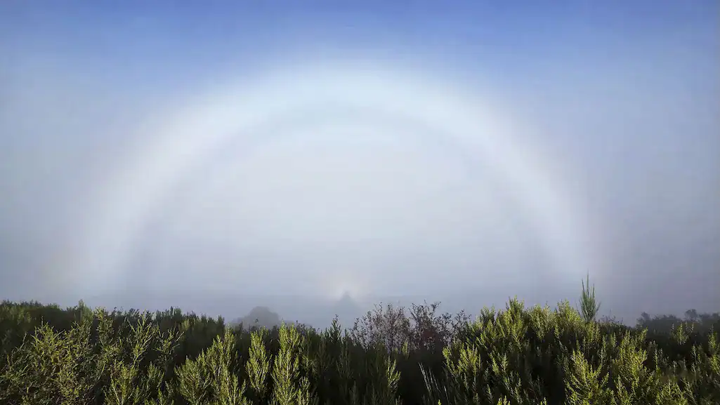 Pero non hai mal que por ben non veña e a néboa permitiunos gozar dun fenómeno óptico, o Espectro de Brocken, onde a sombra se proxectou sobre a néboa por baixo, ao estar de costas ao sol. É unha ilusión que parece unha pantasma xigante e luminosa, pero é pura física, causada pola difracción da luz solar nas pingas de auga da néboa.