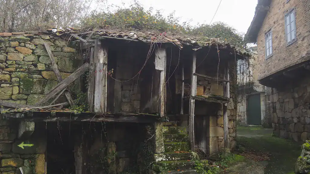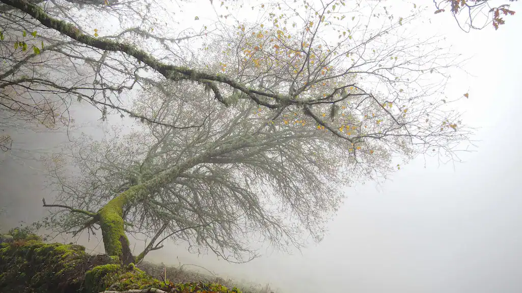 Deixamos o miradoiro e descendemos camiñando acompañados de carballos, castiñeiros… coa néboa facéndose cada vez máis presente no ambiente a medida que baixamos, e salvando o desbordado regato de Trabancas e tamén algún tramo anegado do camiño, o que nos fai ralentizar o paso. Xa en terras do concello de Nogueira de Ramuín, pouco a pouco o camiño volve a ser ascendente ata chegarmos á aldea de Cimadevila, que nos recibe cun fermoso Peto de Ánimas, sinxela mostra de piedade popular, asociada á idea de salvar almas do purgatorio, e construído ou financiado por alguén da zona.