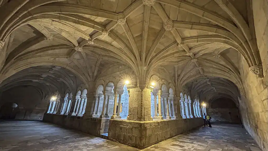 Descendemos polas escaleiras que hai fronte a el e cruzamos o claustro renacentista de portaría, ou dos cabaleiros, de gran amplitude e dimensións, que conduce á cafetería do Parador. Eu demórome un pouco e aproveito para visitar o fermoso Claustro dos Bispos, ou das Procesións, que, xunto coa igrexa, é o máis antigo que se conserva no mosteiro, e tamén achégome ata o pequeno claustro da cociña, que non coñecía, pois aquí estaba a cociña do mosteiro e o refectorio.