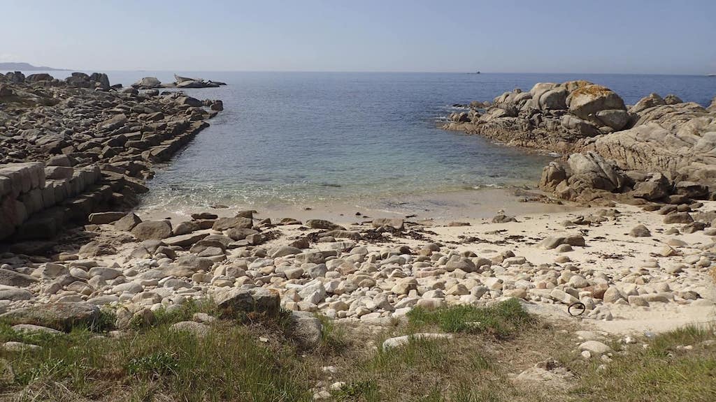Pasado o porto de Aguiño continuamos pola costa, admirando a un grupo de cinco arroaces que deben estar en pleno almorzo, e tamén para deixar correr a imaxinación coas formas que o vento, a auga e o tempo labraron nas masas rochosas da contorna e nos numerosos illotes que se divisan desde o camiño. Pero hai dúas cousas que chaman a nosa atención: os restos do peirao de orixe fenicia da Covasa e o fermoso lavadoiro que hai á beira do mar.