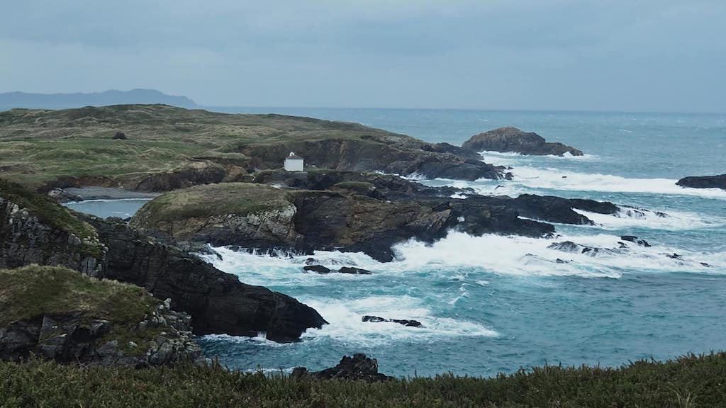 Posteriormente seguimos pola costa sobre os cantís golpeados pola furia das ondas, deixamos á nosa esquerda a piscifactoría e a Capela da Nosa Señora do Mar, tamén coñecida como a Ermida da Virxe do Porto, unha das capelas mariñeiras máis sinxelas, inusitadas e feiticeiras que teño visto… e continuamos camiño desexando que esta Nosa Señora do Porto siga a resistir os embates do fero Atlántico; imos polo camiño de area que nos leva ata o faro da Frouxeira, sempre xunto ao mar. Neste último treito o vento dá con forza, polo que compre ir con coidado polo carreiro pero sen deixar de mirar para os cantís… imposible facelo!