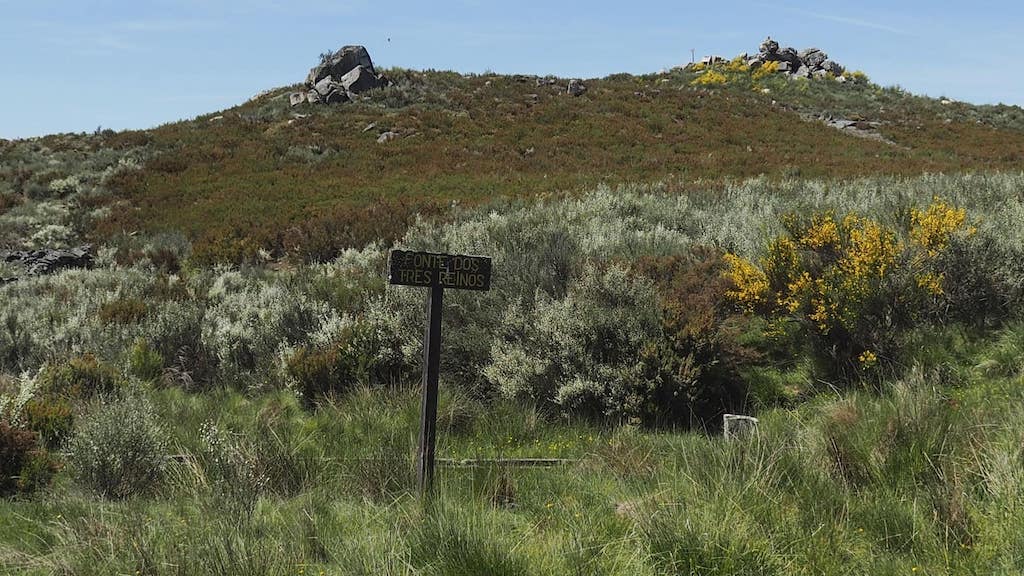 Comezamos camiñando en Cádavos no concello da Mezquita, aínda dentro de Galicia. Á saída da aldea vexo un cartel que informa sobre o camiño ata o penedo dos Tres Reinos e a Ruta da Pana.