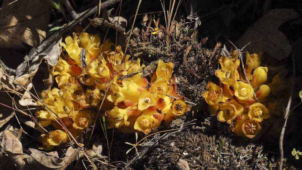 Dous pés de póutega, Cytinus hypocistis, relucían baixo a xesta que trataba de apartar María. Era a primeira vez na miña vida que podía ver esta rareza de planta, cada día máis escasa, segundo me contaron. As póutegas foron moi buscadas en tempos pola rapazada para chucharlles os zumes azucrados que disque deixan un certo regusto ao mel. Deron en ser chamadas, por iso, “mel do raposo”. Pero non é a única expresión que a nosa lingua ten para tan extraña planta. Suso dixo que en Sardiñeiro, polo Sixto, chamábanlle manteigheiras, e salta Placer dicindo que en Vila de Cruces chamábanas patas de vaca… e aínda hai infinidade de nomes: apóutegas, chuchameles, melgas, potas… e en Moimenta Maias!