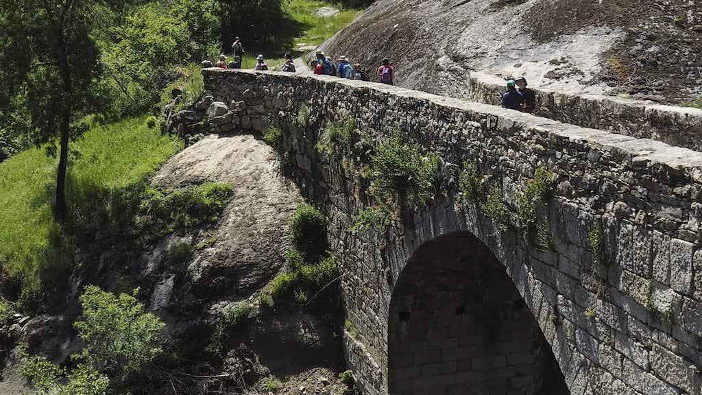 A ponte d’Ás Viñas é unha obra de arte de técnica medieval, que integra un antigo camiño, importante polo empedrado que vemos neste tramo. Cruzando o río novamente por esta ponte e iniciando a subida pola calzada dende onde observamos, no fondo do val, prados de regadío, moitos deles en proceso de abandono. En días solleiros como o de hoxe, non é raro atoparnos con réptiles como lagartos ou cobras, como a que se lle cruzou María, pois desaparecen á mínima percepción da presenza humana, meténdolle un susto no corpo que lle durou ata que chegou á Moimenta.