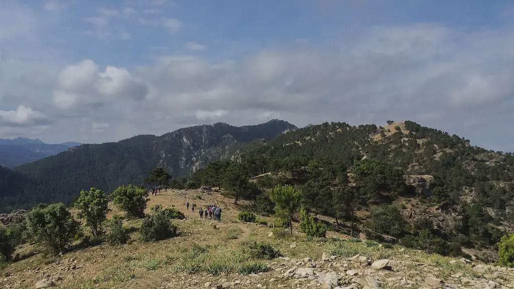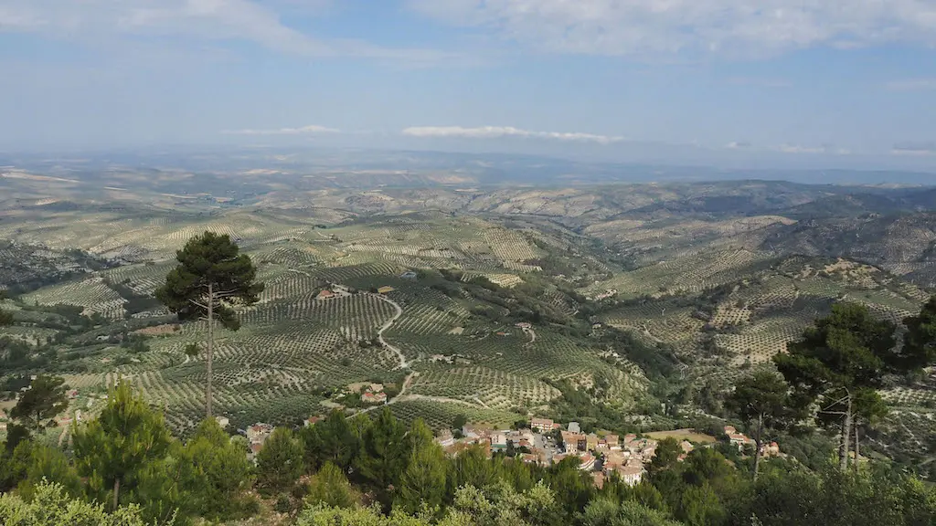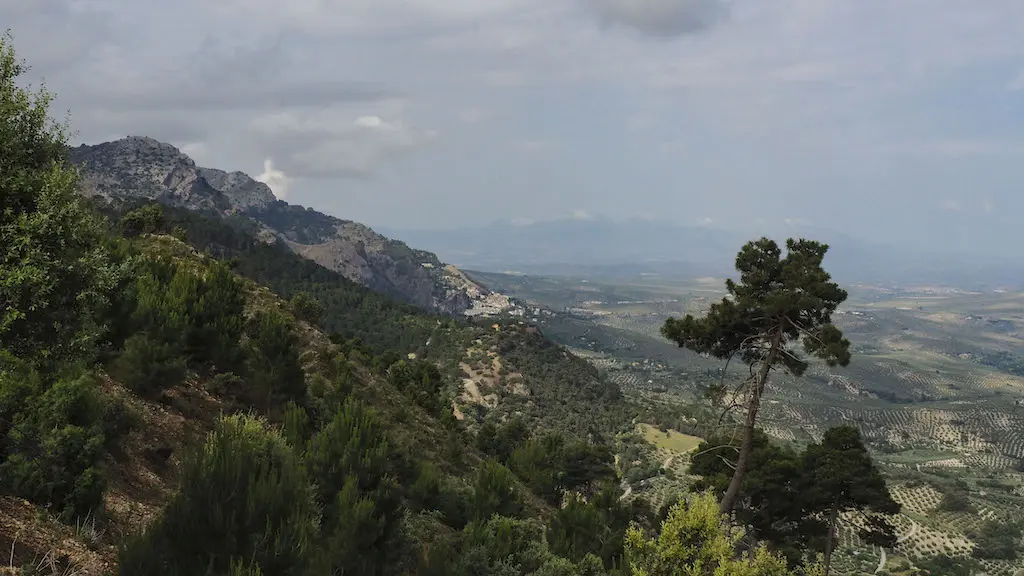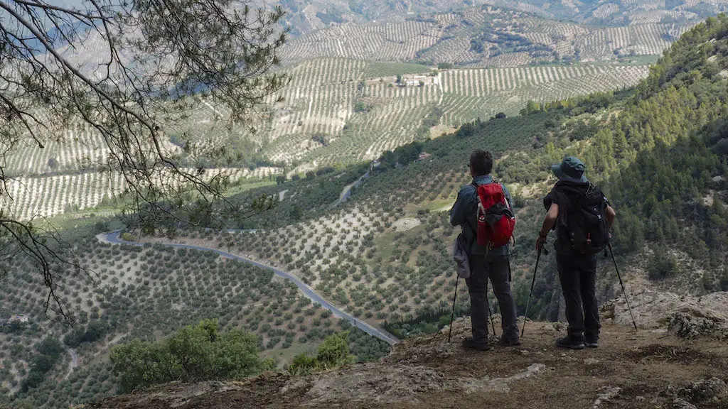 A escaseza de arboledo neste tramo permítenos gozar da visión da campiña olivareira cara ao oeste. As vistas son grandiosas: o macizo de Serra Mágina, Serra Morena, a Lomba de Úbeda, Villacarrillo, e miles de oliveiras aliñadas en distintas direccións sobre o ondulado terreo que ocupa a maior parte da provincia de Xaén. Aos nosos pés queda Burunchel, xa no límite do espazo protexido, localidade pola que pasamos pola mañá, pois é paso obrigado para acceder ao interior do parque polo Porto de las Palomas. Neste punto tomamos un camiño de bastante máis pendente, que serpentea gañando altura rapidamente. Á esquerda contemplamos o Viñuela, montaña de fortes pendentes e escasa cuberta vexetal. A pista acábase e debemos continuar por senda, en ascenso suave, ata o collado situado cara ao sur.