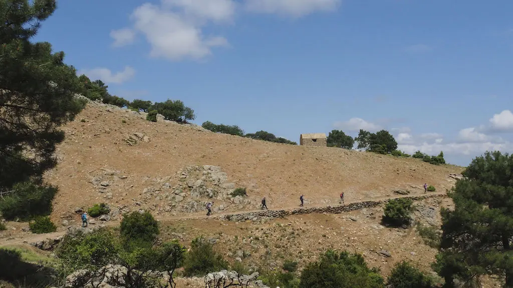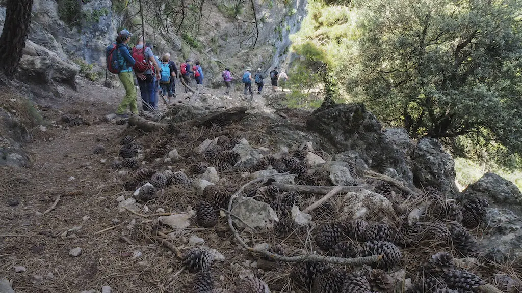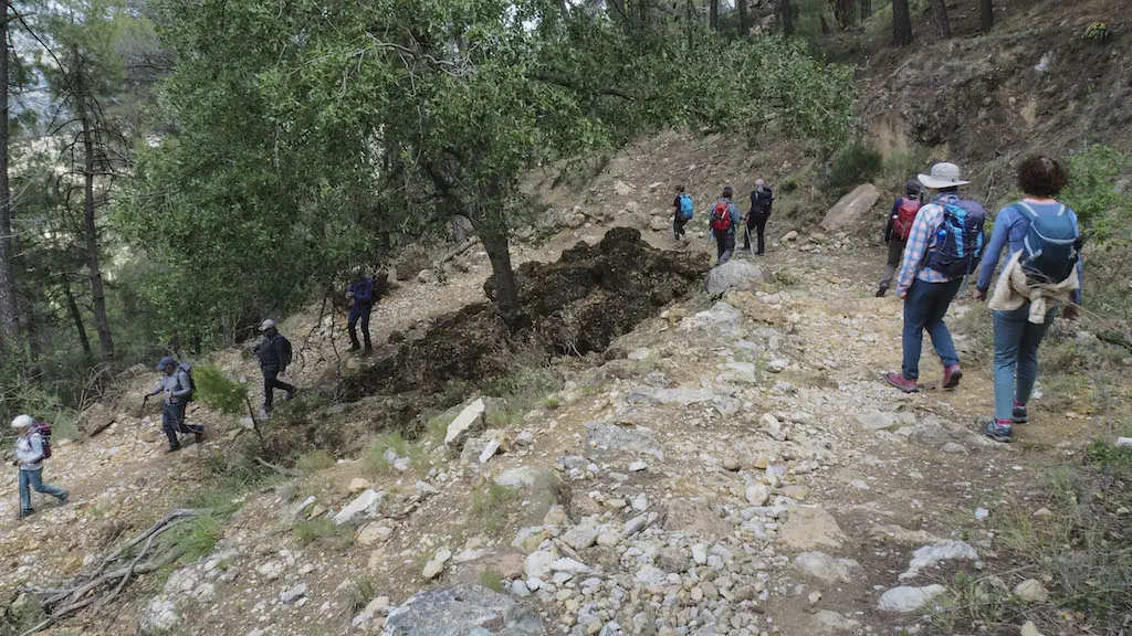 Chegamos a un collado fronte ao Puntal de Correas e a nosa ruta deixa a crista para virar cara á dereita por un camiño ancho, con calzos e calzos e obras en pedra seca impoñentes, que xira unha e outra vez para descender suavemente, adaptándose á difícil orografía da zona. Estamos a percorrer un dos camiños de ferradura máis potentes do carreiro Bosques do Sur, ata chegar á Ermida da Virxe da Cabeza, moi preto xa de La Iruela.
