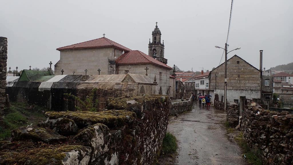 Non enredamos moito polo adro, pois as campás tocan a morto e a chuvia xa comezaba a ser persistente. As previsións meteorolóxicas estánse a cumprir en todas as etapas, nas que tivemos de todo, dende altas temperaturas nas primeiras xornadas ata frío e auganeve no tramo de hoxe, o que nos impedirá ver nalgún momento a fermosura dos vales salpicados por pequenas aldeas como Feás ou Magros.