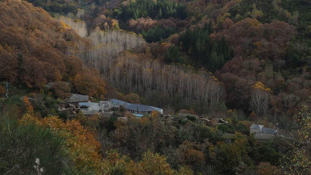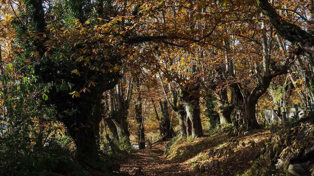 Pasado Gundriz, logo dun pequeno tramo por estrada, iniciamos a forte e longa ascensión ao cumio, situado a 1477 m de altitude. De novo imos por camiño alfombrado de follas douradas e a medida que subimos de cota vanse abrindo cada vez máis claros no bosque, deixándonos as árbores ver cada vez mellor a paisaxe que se abre ante nós (sobre todo ás nosas costas), capitalizada fundamentalmente polo val do río Lóuzara e pola serra do Courel. Se antes o sol era tamizado polas follas douradas dos castiñeiros, agora son as nubes as que deixan pasar uns raios que iluminan a aldea de Praducelo e o seu entorno.