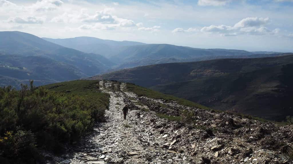 De feito, dende o cumio, segundo miras a Triacastela, xusto no monte de enfrente, xa están facendo un parque eólico novo. Nese monte fixemos tamén unha ruta no seu día, no Pico de Santa Irene, ou Pico de Meda: https://roteiros.gal/de-samos-a-triacastela/
