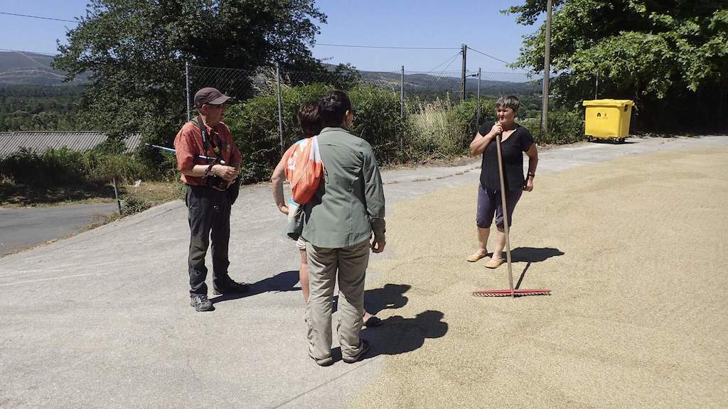 A pesares de que imos con tempo, o percorrido facémolo rápido, permitíndonos admirar de novo San Cristovo e andar polo seu adro, practicamente pechado polos nichos. Tamén aproveitamos para botar unha parrafada cunha veciña de Busto mentres estende a semente de raigrass polo campo da festa para que seque, e poder sementalo máis adiante. Bueno, campo da festa, aparcadoiro cando hai enterro, eira… un espazo arreglado polos veciños e de uso comunal, segundo nos di.