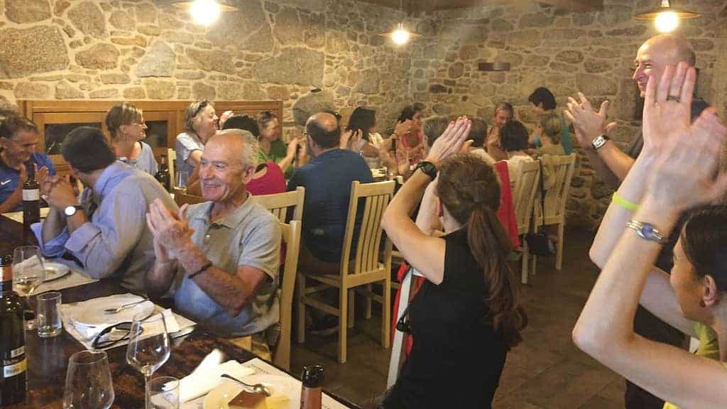 Ao rematar, o bus levounos ata Olveiroa, pois fomos xantar no mesón As Pías, moi preto de alí, poboación que adoita ser final de etapa no camiño. O menú encargado é o seguinte: Ensalada da casa (boqueróns, tomates, aceitunas, croquetas e chipiróns). Ameixas. Robaliza con guarnición de ensalada. Táboa de carnes (chuletón, segredo e solombo). E de postre, flan caseiro. Todo acompañado con viños tinto mencía, branco godello e refrescos… e cafés. Todo estivo estupendo, pero quédome coa ensalada e co postre.