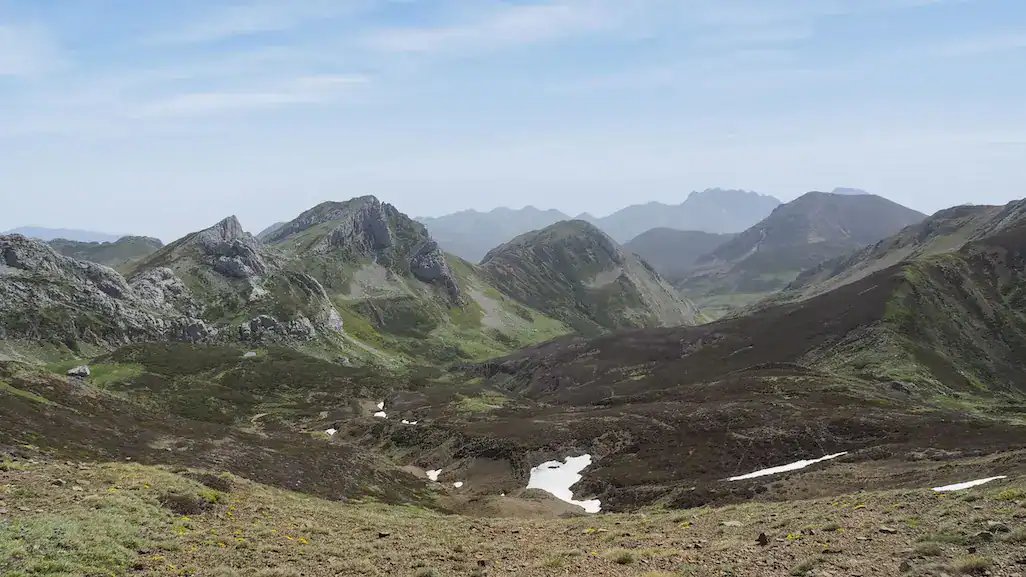Esta subida que nos queda, aínda que un pouco empinada, non ten ningunha dificultade, e acadar a cima compensa o esforzo. Ao chegar arriba, á crista, de súpeto atopámonos cun amplo balcón á grandiosa paisaxe das terras de Somiedo. Desde este balcón soamente temos que seguir a crista pola nosa esquerda. Eu vou quedar nela gozando das vistas, mentres o resto anímase a rubir polas rocas dunha zona estreita (sen perigo nin vertixe, polo que me dixeron despois), e xa os vexo coroando tranquilamente Peña Orniz.