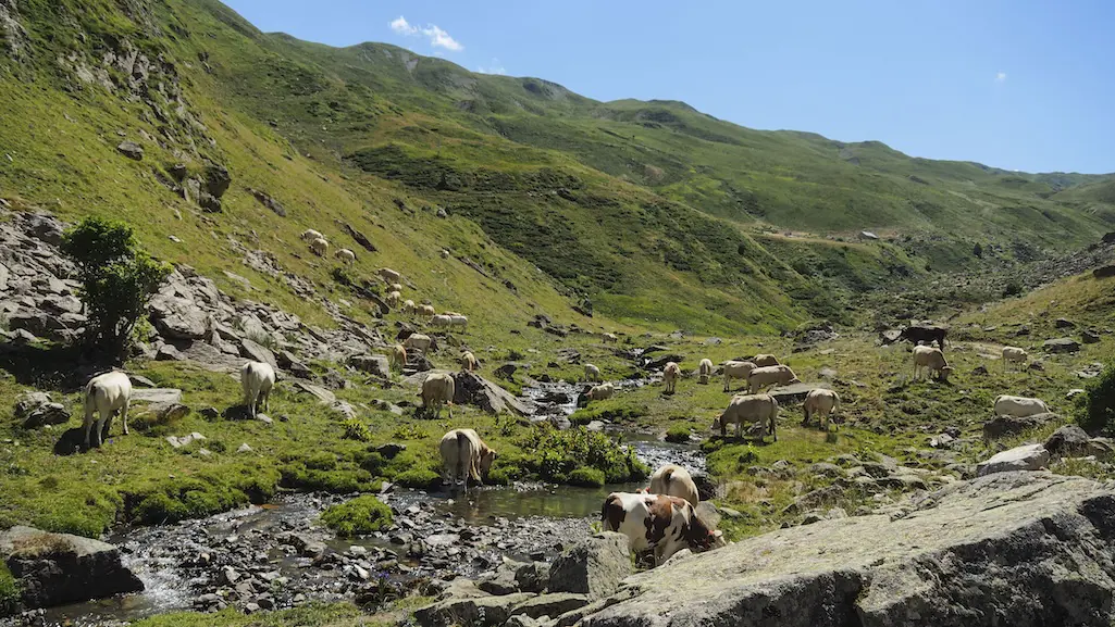 Ata o refuxio temos que salvar aproximadamente uns 880 m de desnivel e a partir de aquí xa non teremos mais sombra que nos protexa… e o sol comeza a quentar con forza. Que ben se subía baixo a sombra do faial! Aínda non temos ao noso alcance a totalidade das vistas sobre o Pic du Midi, pero as panorámicas que temos arredor son espectaculares, onde predominan os pasteiros, aproveitados por numerosos rabaños de vacas e de ovellas gardados polo pastor, únicos moradores estivais destas montañas.