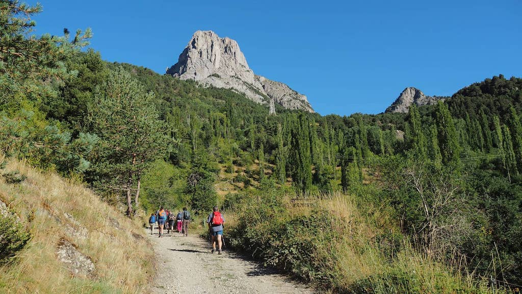 Xa fóra do núcleo urbano de Sallent, camiñamos por unha pista agrícola que discorre pola marxe dereita do río Aguas Limpias. Ao cabo de aproximadamente 1,5 km arrinca á esquerda un vello camiño que, rapidamente, ascende ata a estrada que dá acceso á Sarra. Por ela, e en fila de a un, non tardamos en alcanzar a presa.