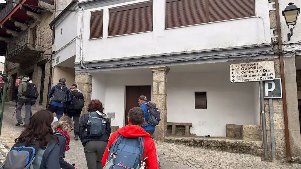 Na mesma praza, María e Carmen enredan cun home na porta do concello. É Antonio, que está encantado de que lle falemos en galego e dá gusto escoitalo na fala e ver como valora a súa língua, que neste pobo ten unha variante, o lagarteiru. Deixámolo case coa palabra na boca, pois temos que avanzar e ir cara o castelo, camiñamos polas súas rúas apreciando a súa arquitectura, as casas empolícanse na ladeira e asentan os seus cimentos nas pedras de granito.