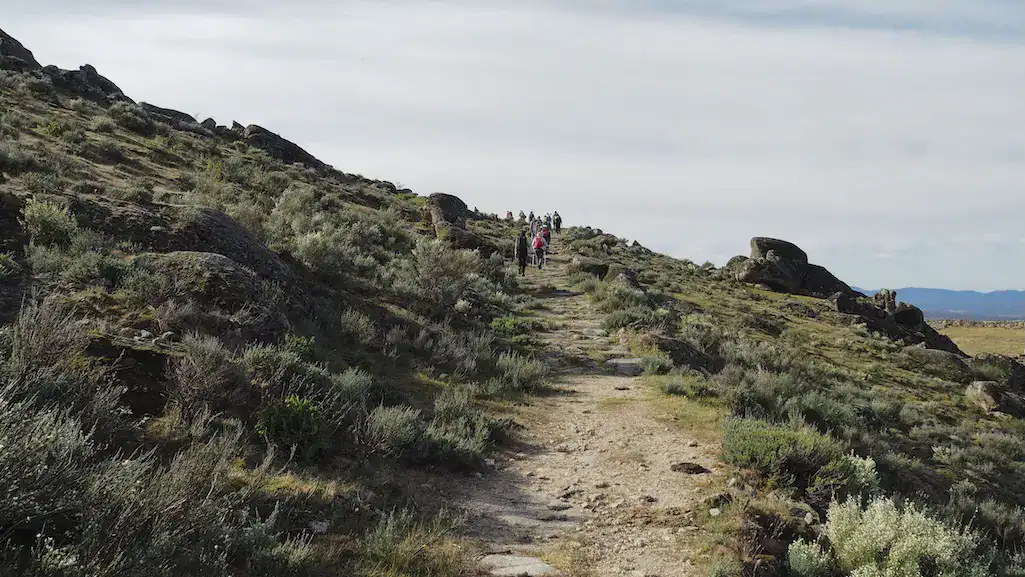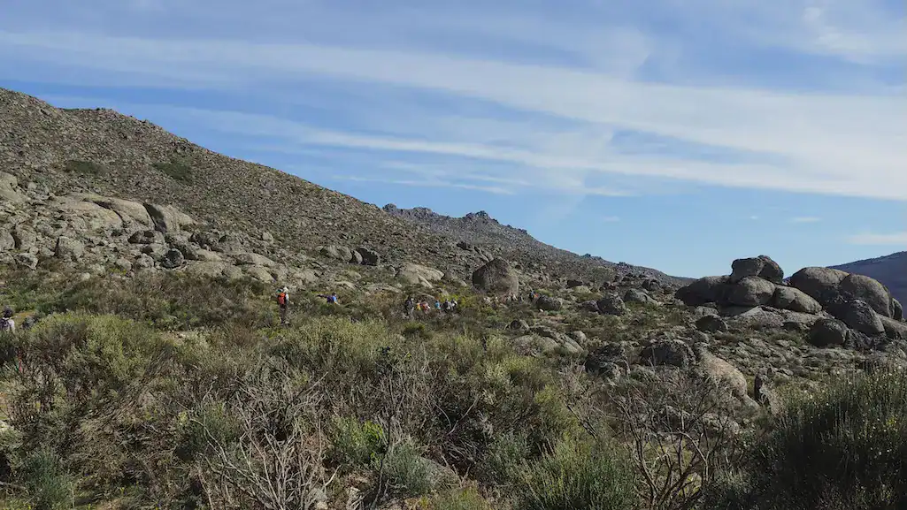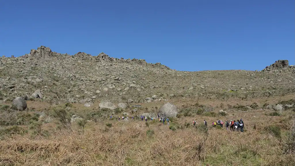 Andamos polo Camiño do Porto e, logo de atravesar uns pastos con gando bovino e caprino e pechar unha última cancela, acadamos o alto de Santa Clara (1020 m.), famoso por ser límite entre as provincias de Cáceres e Salamanca, Á nosa esquerda un valo de pedra construída para separar ambas as provincias. Decidimos aproveitar este espazo para descansar e xantar, logo de que un grupo de sendeiristas portugueses, igual de numeroso que o noso, nos deixase o sitio ao reemprender a súa marcha en sentido contrario ao noso.