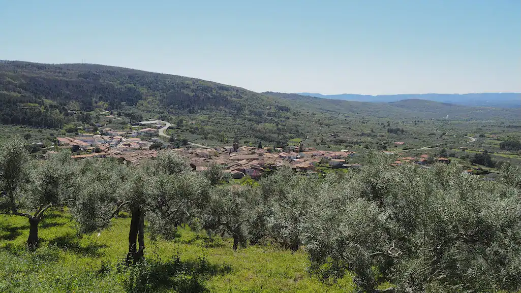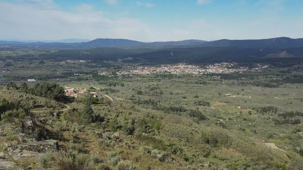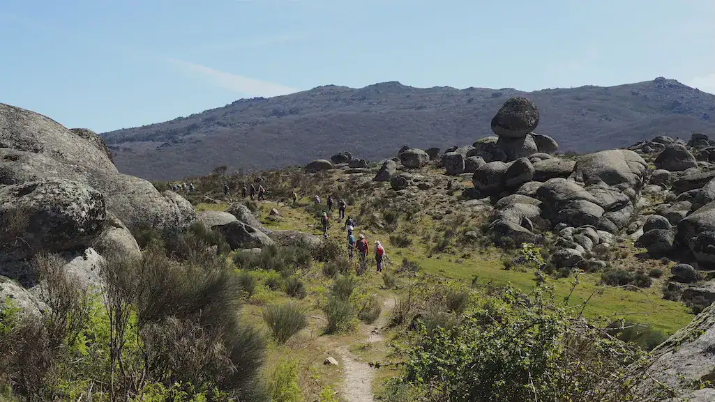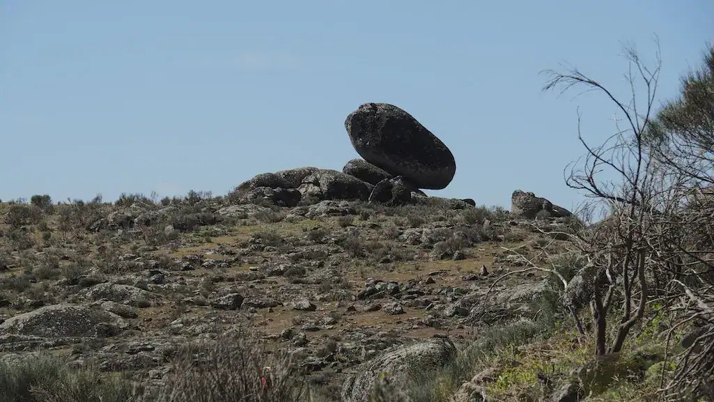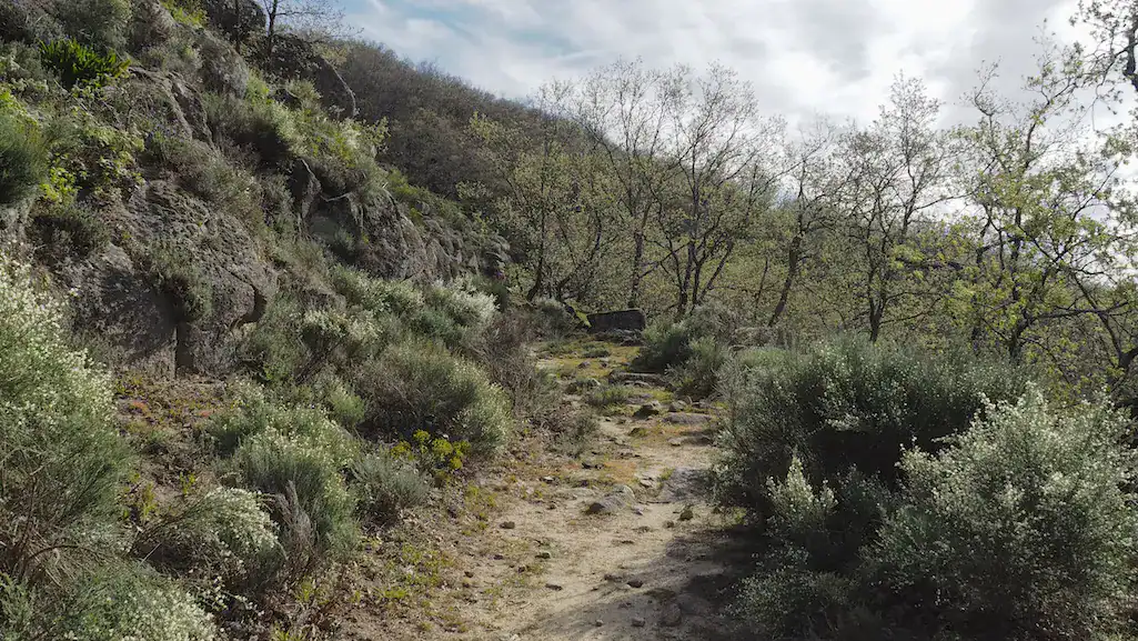 A medida que o camiño se vai convertendo nun cómodo sendeiro que ascende suavemente, pouco a pouco xurden formacións rochosas, destacando unha manchea de pedras cabalgadas. A partir de aquí, tamén comezamos a apreciar as vistas abertas do val, o berrocal granítico na ladeira do coñecido como Cancho Peñaflor e, no fondo do val, o pobo de Sa Martín de Trevellu, o noso punto de chegada; máis arriba o Pico Jálama cos seus 1492 m é o pico de referencia da zona.
