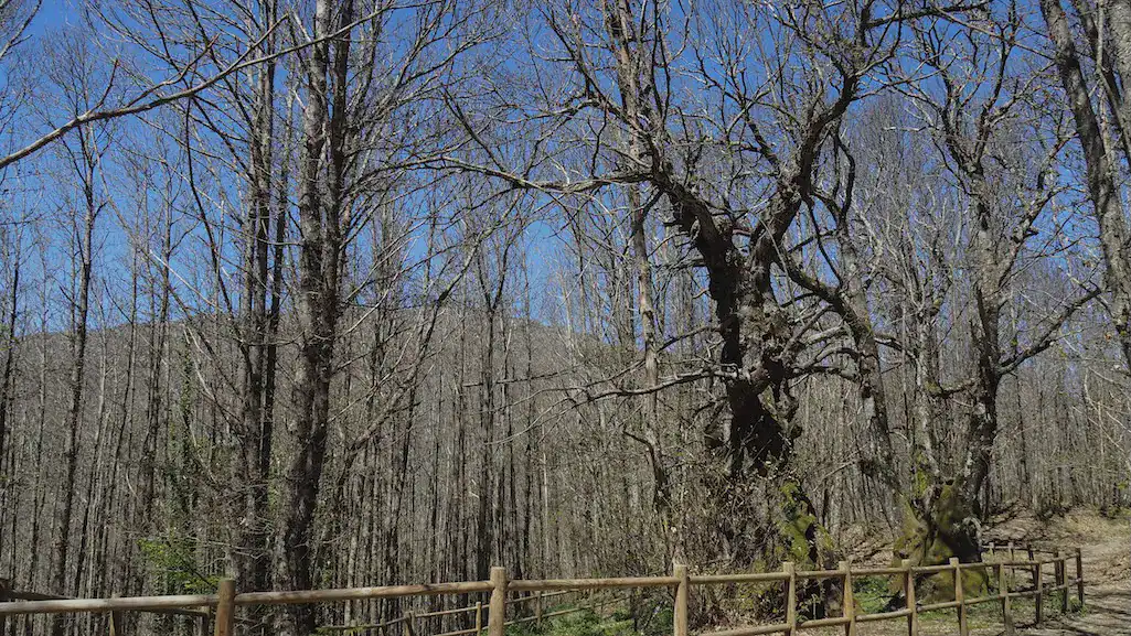 Transitamos pola calzada empedrada, atopando unha pequena ponte de pedra por onde brue o Torrente de la Vega que nos conduce aos castiñeiros centenarios, dous exemplares ben protexidos e delimitados por un valo para asegurar a súa protección, coñecidos como os Castaños del Cobijo, ambas árbores declaradas Árbores Singulares de Estremadura. Coñecidos como os “avós” no bosque dos Ojestos ou os Ou’Soitu.