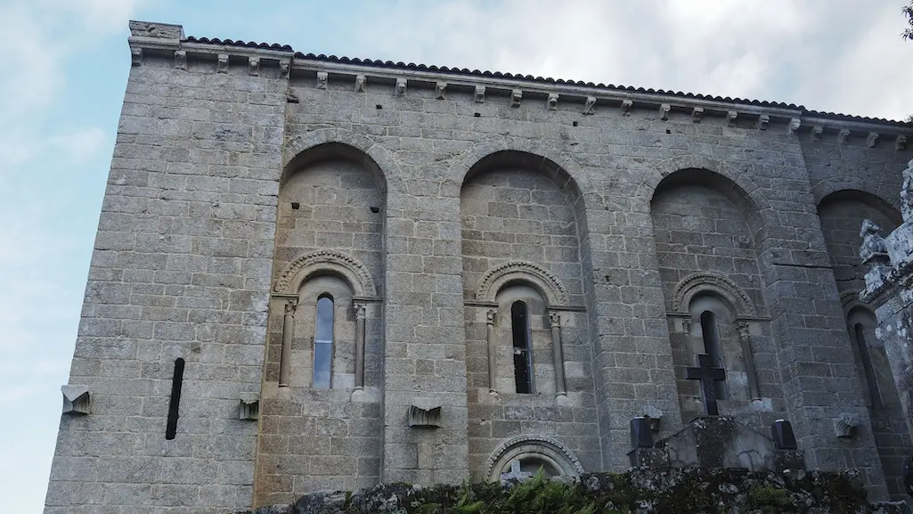 Chegamos a Santo Estevo e temos un momento para gozar do templo e do seu entorno. O que máis chama a atención é a súa adecuación ao terreo, para o que foi preciso rebaixar a ladeira así como construír unha cripta para soster a base do templo. A fachada é unha obra espectacular do románico galego, cunha portada flanqueada por dous arcos cegos decorados con piñas e rosetas. Destaca a decoración da porta central con seis estatuas radiais de músicos, e un personaxe relacionado co sol e a lúa, que mostra un motivo circular. Na escultura destes personaxes e na súa disposición apréciase a influencia do Mestre Mateo e o Pórtico da Gloria. Por riba dos arcos podemos ver o gran rosetón, característico deste mosteiro e considerado dos máis espectaculares de Galicia. A espadana sitúase na parte posterior sobre un muro de suxeición do terreo que conforma o adro.