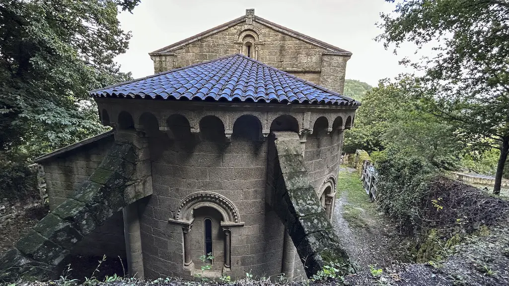 Encostado á igrexa atópase un dos poucos exemplos de arquitectura civil que hai en Galicia desta época, o antigo palacio de verán dos bispos de Lugo, que hai dez anos atopamos en ruinas e hoxe habilitado como un albergue público. Decidimos parar a xantar pois hai previsión de chuvia próxima e que mellor lugar para facer un descanso e xantar comodamente diante desta marabilla arquitectónica!