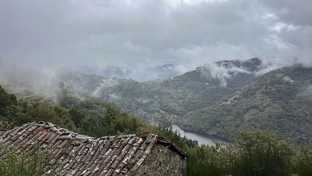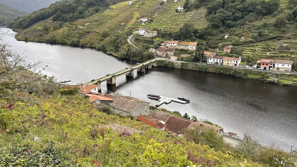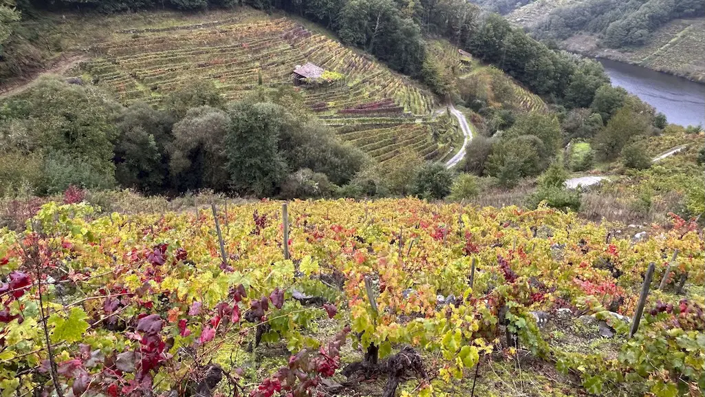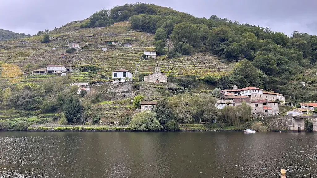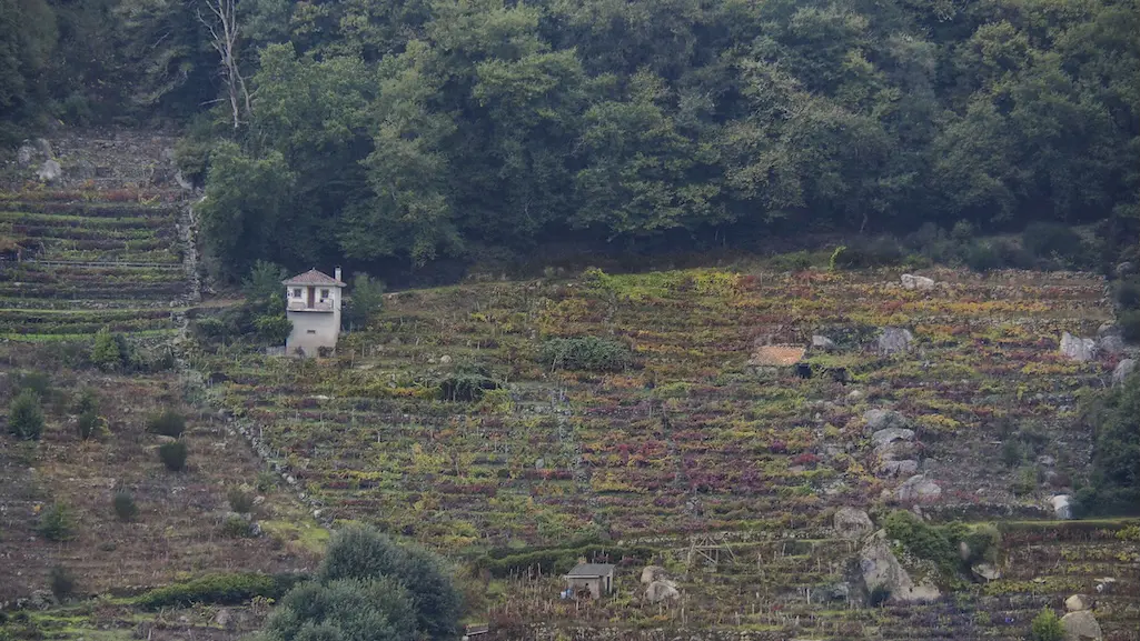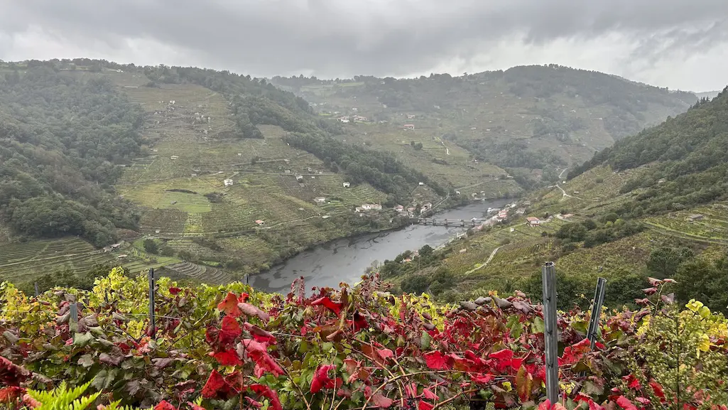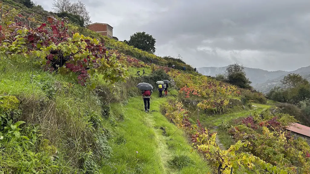 A chuvia comeza a se intensificar e non queda outra que continuar o noso camiño por este lado do río. Protexidos con chuvasqueiros e paraugas, toca unha subida continua entre os socalcos e o esforzo fai que valoremos aínda máis aos traballadores destas viñas. A pesar da chuvia, é unha subida fácil, na que temos que salvar o desnivel para chegar ao alto e algún pequeno treito con lama, pero que compensa pois ímonos marabillando a cada paso ao ver o val dende o alto. Comezamos a recuperar pronto as vistas cara ao río rodeados de viñedos, podendo apreciar estupendamente a viticultura heroica que se fai nesta zona, da que xa teño falado noutras entradas.