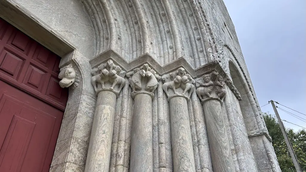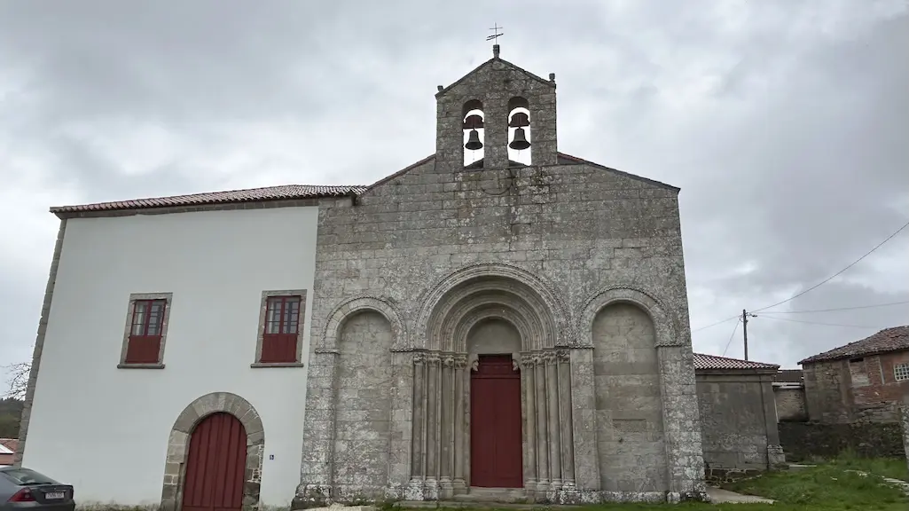 Estamos ante outro magnífico exemplo de románico compostelán, tendo grande semellanza coa de Santo Estevo de Ribas de Miño. A fachada ten tres portas, as laterais cegas e a central ábrese cun arco de medio punto con catro arquivoltas que descansan sobre fustes de mármore dunha soa peza, no que destaca a rica decoración escultórica da súa portada, onde se combinan motivos de tipo vexetal e xeométrico con figuras de seres mitolóxicos. O templo pertenceu orixinalmente a un mosteiro cuxas orixes foron vinculadas pola tradición ao bispo Odoario, unha figura destacada do século VIII.