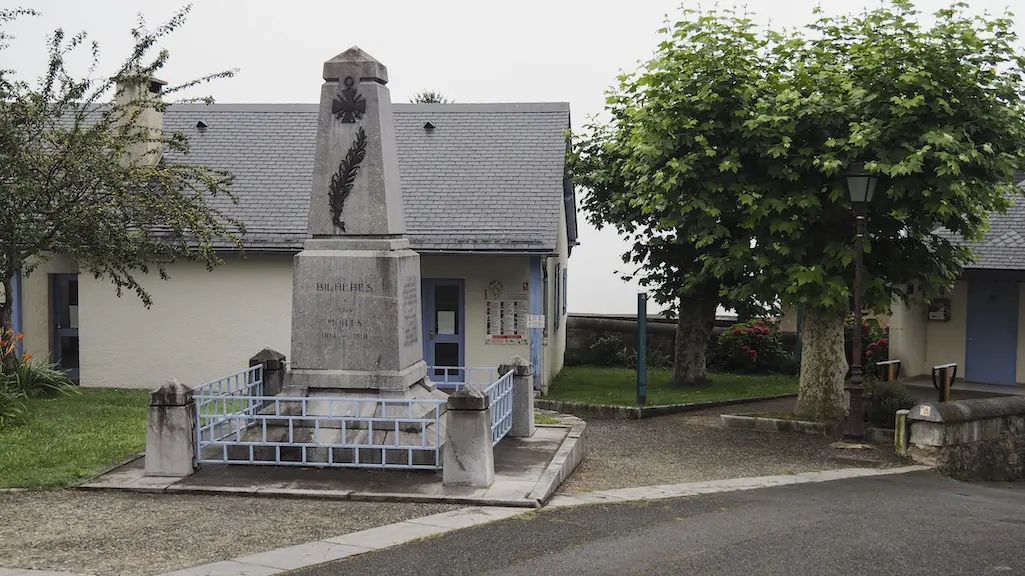 Pouco a pouco deixamos Bielle e tomamos o Chemin de Lasserre, unha corredoira duns oitocentos metros pola que temos que ir a modo para non esvarar nas pedras molladas que a cubren. O camiño é fermoso, todo cuberto de vexetación e con bastante desnivel. Por fin chegamos a unha cruz que supoño que forma parte dun via crucis, pois tamén pasamos por algunha en Bielle. Reagrupámonos para entrar en Bilhères e decidimos facer unha pequena parada neste punto. Facemos uso dos baños públicos que hai no entorno da Mairie e da igrexa, onde tamén hai un monumento na lembranza dos caídos na Gran Guerra. Que coidado está todo!