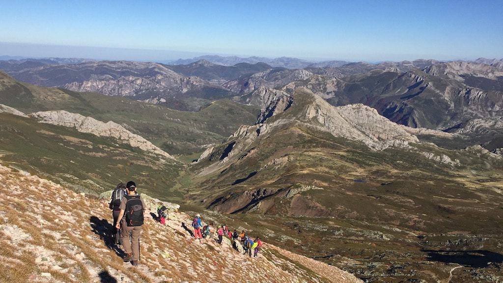 Ente o Víctor e tres rapazas da zona que subiron atrás de nós, aclaráronos todo o que estabamos a ver e preguntar: cara ao leste divisamos, moi lonxano, o Macizo das Ubiñas, os Fontanes ou o Cirbanal, e xa máis próximo El Puertu, Santa María del Puerto de Somiedo, de onde sae unha das vías para chegar ata aquí, que cruza pola Vega Almozarra, máis cercana. Embaixo o Pico Asta e mais ao lonxe, á esquerda o Penouta. Observamos perfectamente dende este pico a actividade modeladora dos glaciares, que deixaron afiladas aristas, así como os vertixinosos e curtos vales no seu lado norte. Víctor amósanos tamén un escarpe a modo de conco pedregoso, no seu límite con Peña Rubia, formado pola acción erosiva do xeo.