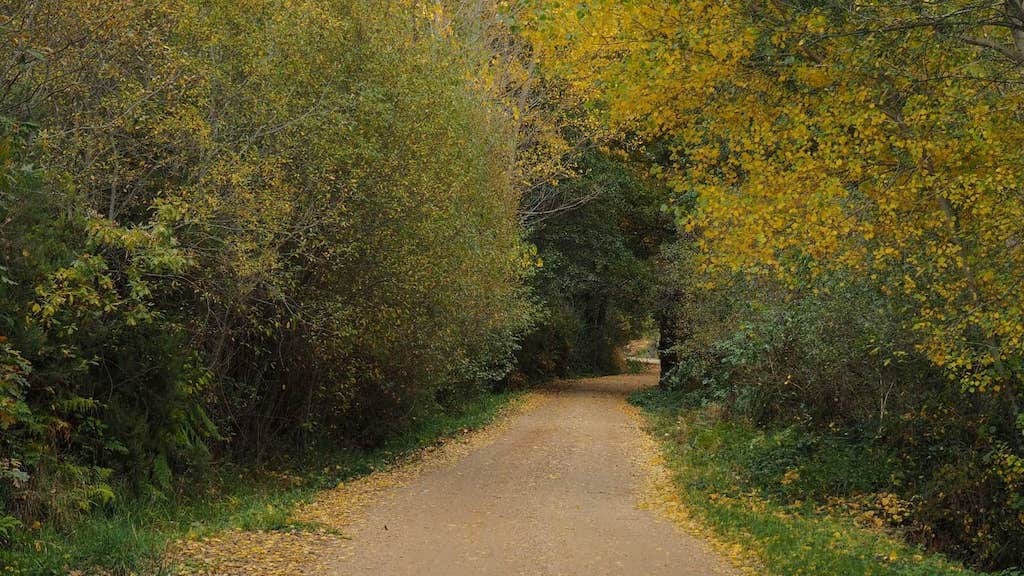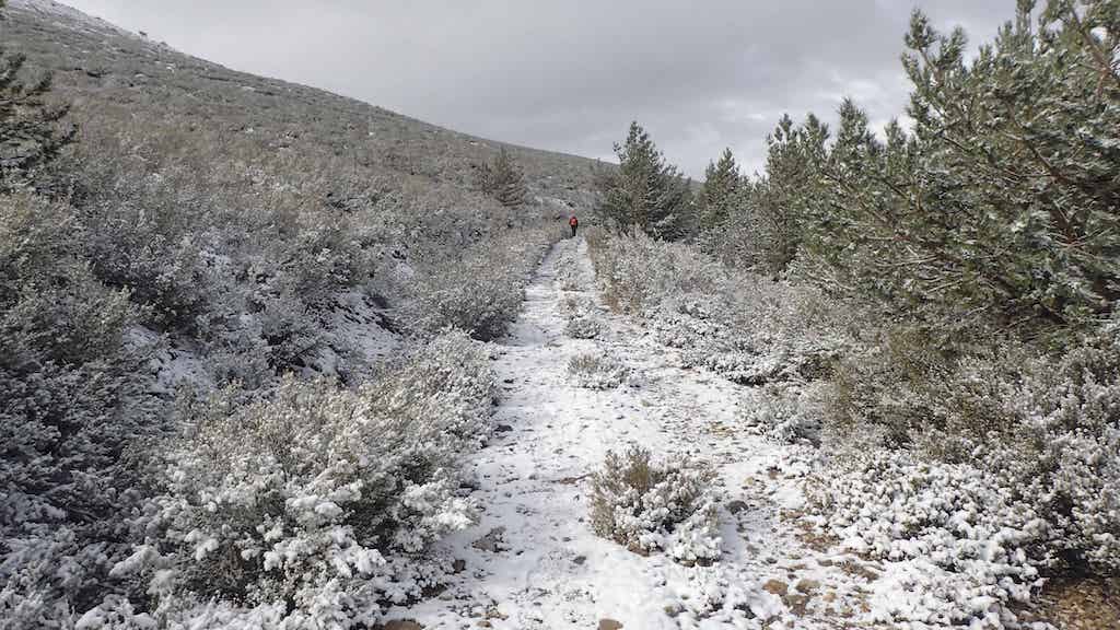 Cando iniciamos o descenso por pista cara a Molinaferrera practicamente xa non hai neve polo camiño, o que se agradece pola pendente dalgún tramo. Agora tócalle sufrir un pouco aos xeonllos. Nun ambiente totalmente distinto ao da mañá, resultou un final de etapa espectacular, pois unha vez cruzada a ponte sobre o río Cabrito fomos gozando das cores amarelas das follas dos álamos e outras árbores de ribeira que hai ao longo do seu curso, e por onde comezan a filtrarse os raios dun sol de outono que potenciaba as súas cores. Unha gozada!