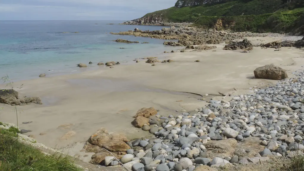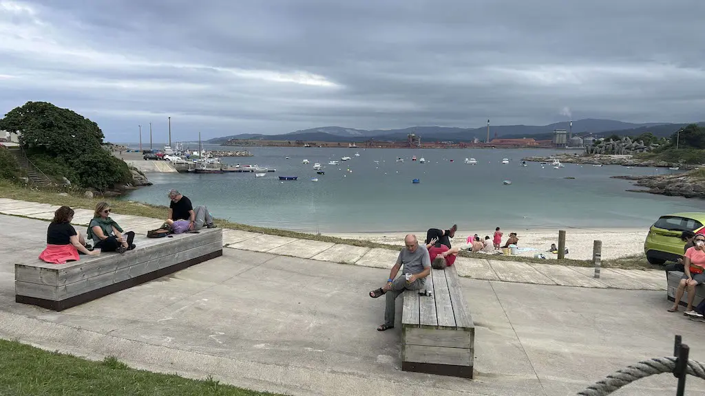 Tal vez sexa esta a parte máis complicada da ruta polo descenso que temos afrontar, con terreo algo inestable e bastante costento pero, como digo sempre, sen complicacións se o facemos con sentidiño. A baixada déixanos diante das ruínas da ermida de San Tirso, que se abandonou no 1929 ao construirse unha nova igrexa no núcleo de Vilachá, antes de entrar na enseada de Portocelo. Percorremos a rada ata o fondo, superamos o pequeno porto e decidimos parar a xantar á beira da praia, na zona habilitada con mesas e baños públicos, moi limpos, por certo.
