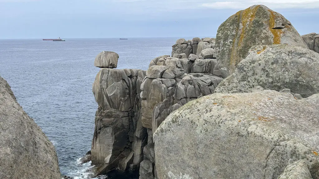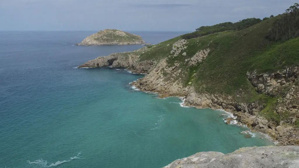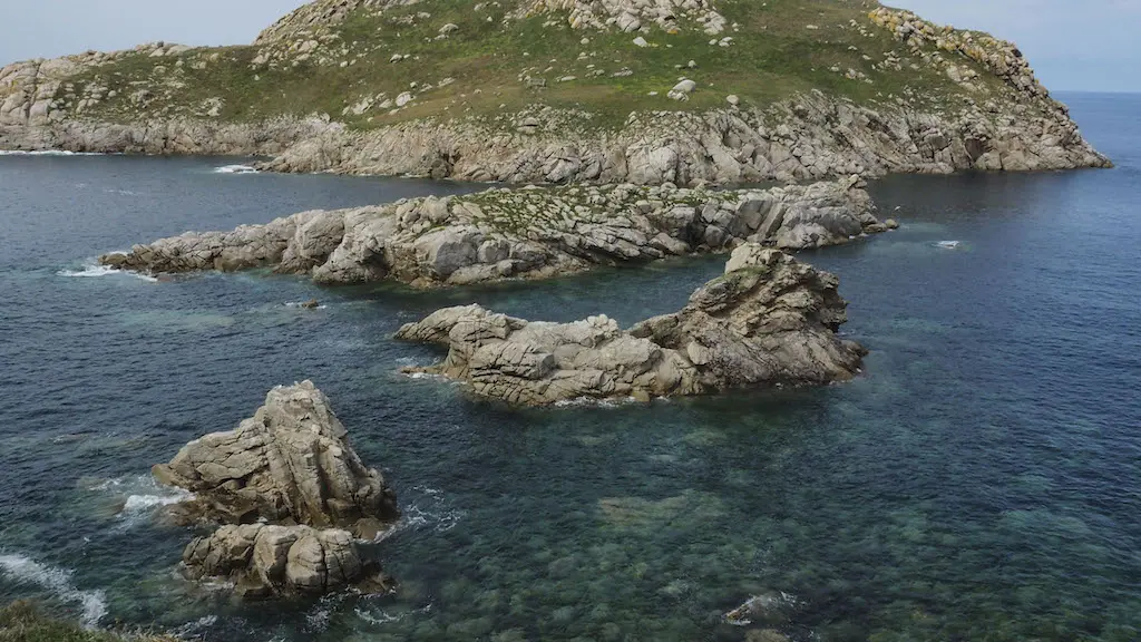 Descendemos do Monte Castelo e deixámolo pasando por outra rocha con nome, a Pena Sombreireira (que ben que se recuperen estes topónimos para que non caian no esquecemento), que se asemella á porta dunha cova, e que nos amosa máis de cerca esta zona acantilada, de difícil ou imposible acceso, prolongada en illotes onde só medra a vexetación das pendentes rochosas, contrastando en verde coa branca orla litoral e o azul turquesa das enseadas, que agochan tanto coídos como praias solitarias, ás que só se pode acceder por mar.