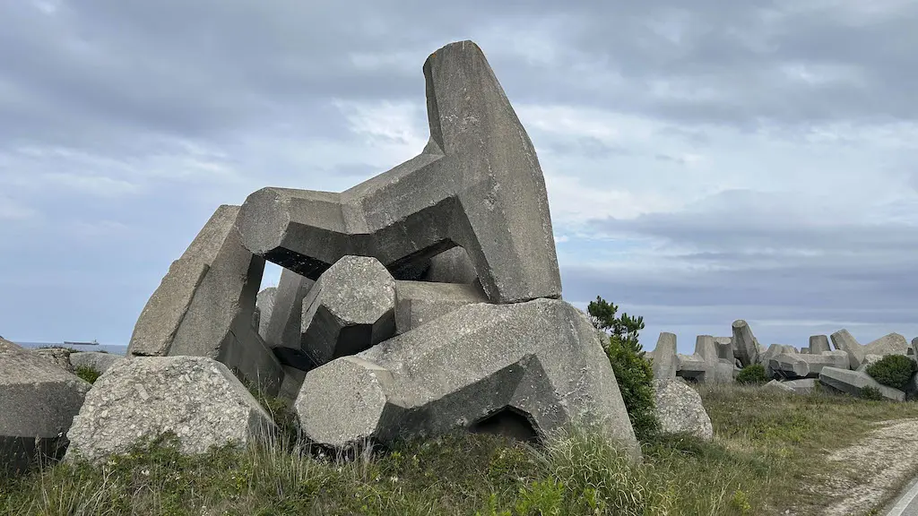 Temos á vista o Cabo de Morás, e tamén comezamos a ver as instalacións da empresa de aluminio de San Cibrao, distinguible pola súa cor granate que contrasta con toda a paisaxe da que estivemos gozando durante toda a xornada. No cabo, dirixímonos aos Cantís de Papel atravesando a antiga zona de fabricación de dolos, enormes estruturas de formigón que quedaron abandonadas tras a construción nos anos setenta do século pasado dun gran dique para o porto industrial, que necesitaba a empresa de aluminio de San Cibrao.