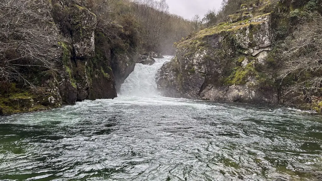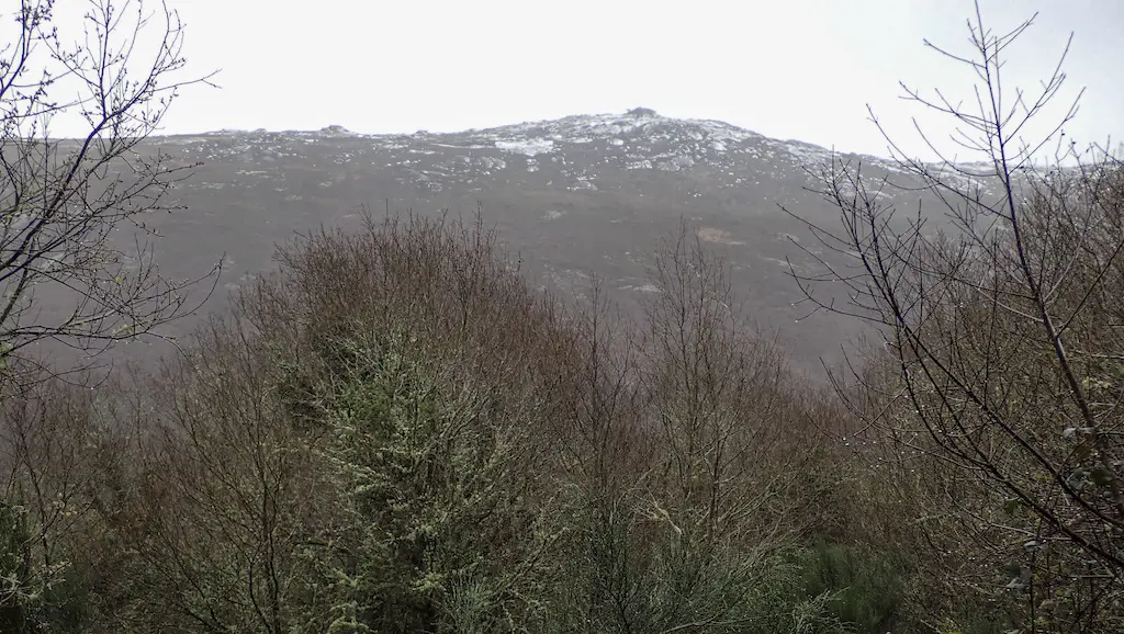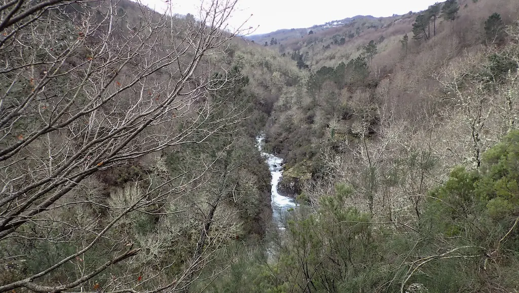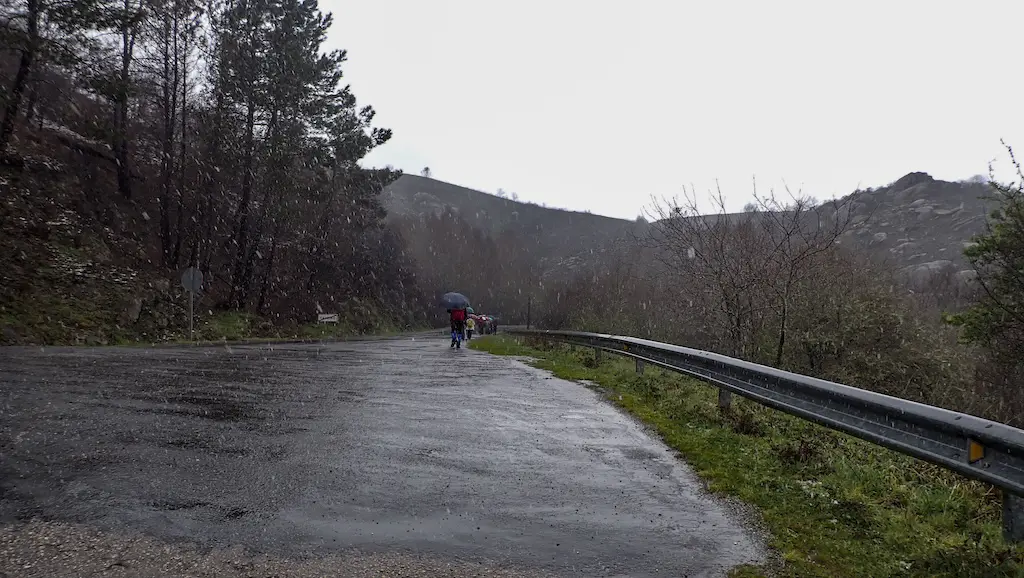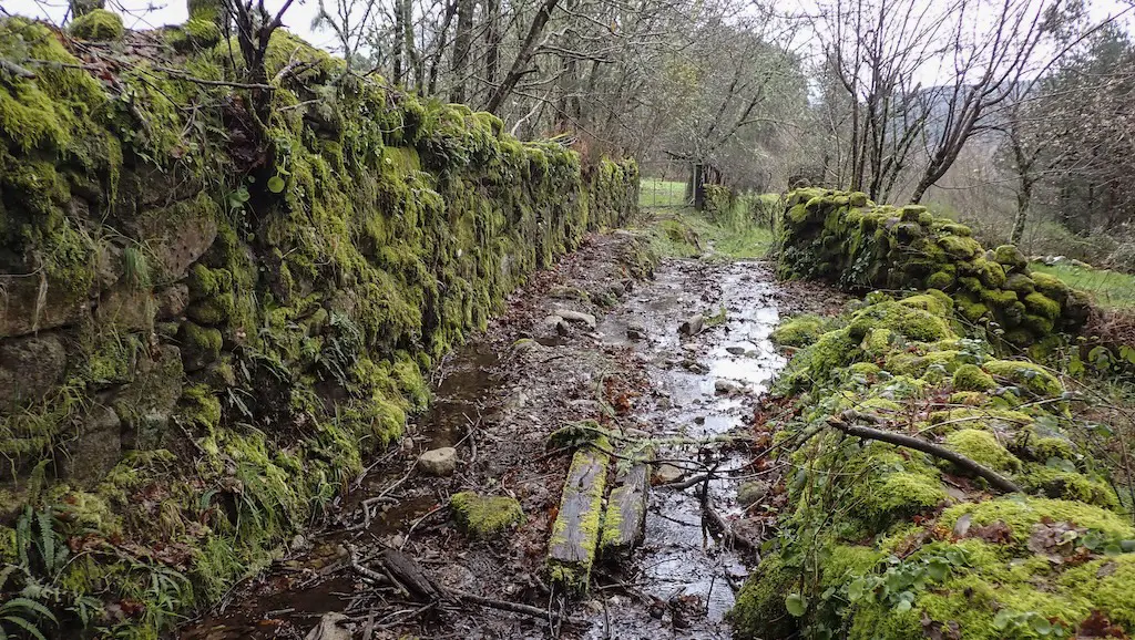 Imos case ata o fondo do val seguindo o camiño sempre por bosque ata chegar a outra pequena ponte. Aínda que non ten varanda non hai problema en pasala. Volvemos cruzar o Cubelo e ímonos separando do río a medida que comezamos a subida ata o lugar de Caseiro, o punto máis alto do percorrido, a case 700 m de altitude. O camiño continúa sendo moi fermoso, encaixado entre balados e vellos muros de pedra, pero a chuvia a cachón non ten piedade de nós e non queda outra que volver meter os pés na auga que baixa por el. Pouco antes de chegar a Caseiro, podemos ver os cumes da serra con neve… e coido que nos está a caer auganeve. Nótase a diferencia de temperatura con respecto ao val.