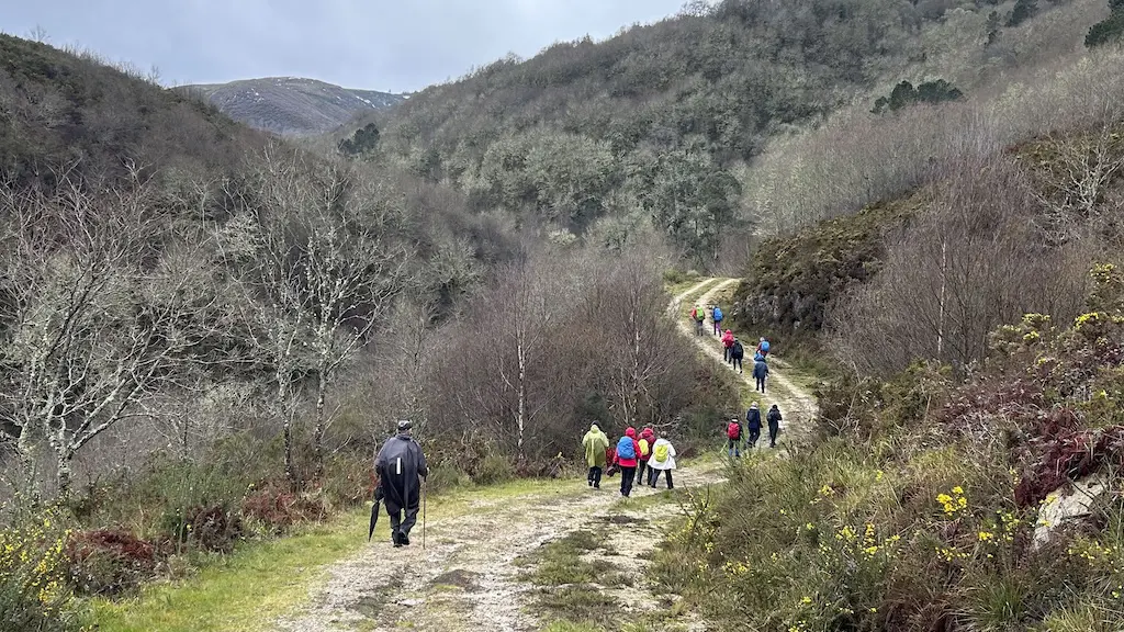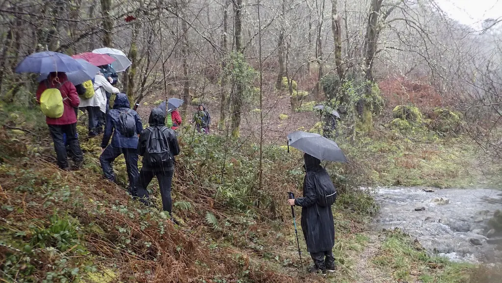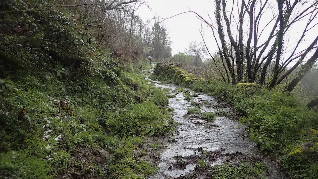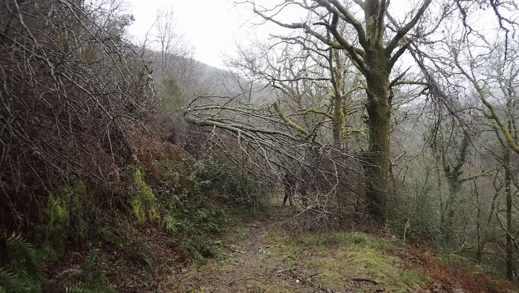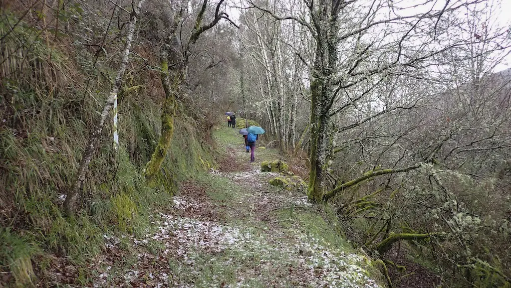 De novo na ruta, a chuvia vai volver e vainos acompañar en gran parte do percorrido. A pesar de que o camiño é case sempre bastante ancho, ímonos atopar con árbores caídas e moita auga, o que nos obrigará a salvar dúas ou tres torrenteiras que medraron coas fortes chuvias. Ademais, o sendeiro estaba moi charquento polo que non quedou máis remedio que meternos un pouco neles para poder avanzar.
