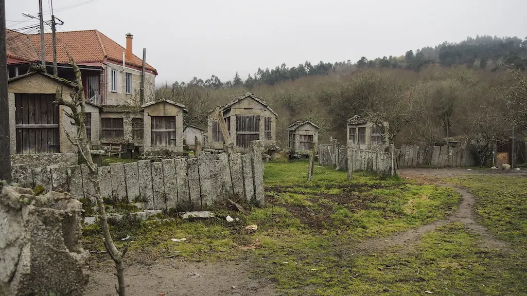 Logo de tomar o café e de prepararnos convenientemente para a andaina con chubasqueiros, pantalóns de auga, paraugas… iniciamos o percorrido polo medio do pobo no que as casas tradicionais mestúranse na paisaxe con grandes chalés de veraneo dos veciños emigrantes mexicanos, que chaman a atención polas súas dimensións. Non descubro nada ao dicir que Avión é o pobo de veraneo de numerosas familias que emigraron a América para facer fortuna e que regresan en vacacións ás súas raíces. Non sei no verán, pero no inverno semella estar todo pechado.
