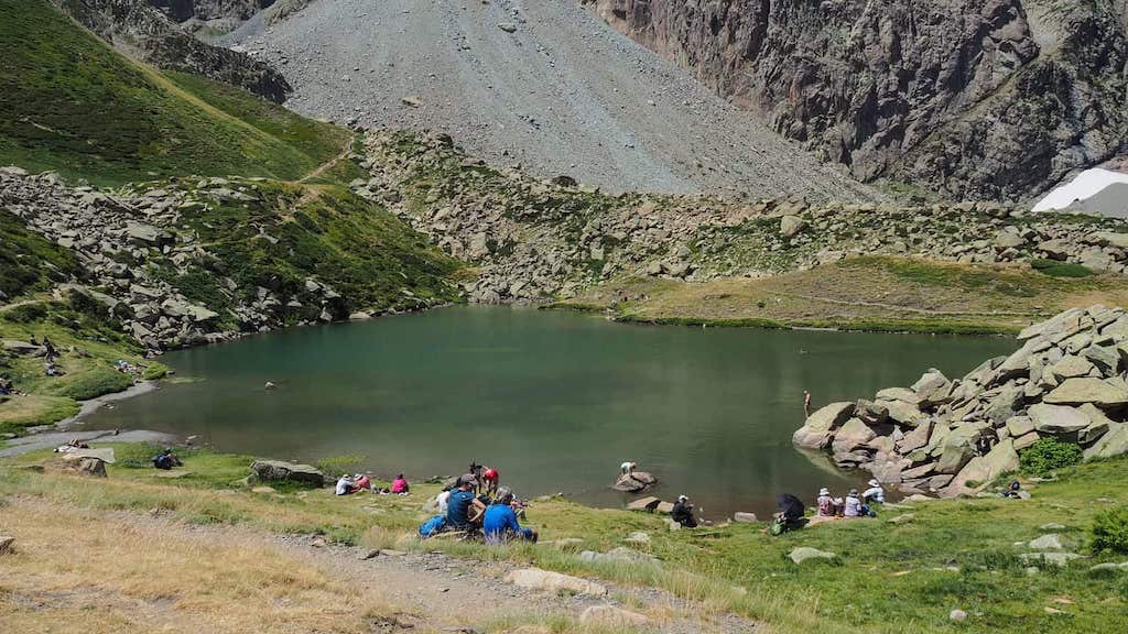 Aínda non nos estamos acomodando para xantar á beira do ibón cando vemos descender ao grupo procedente do Peyreget. Xantamos xuntos, contamos as recírpocas impresións e o esforzo que tiveron que facer no ascenso, a calor que pasaron e, tras unha curta parada, preparámonos para continuar. Debemos iniciar o camiño de regreso cun pequeno ascenso desde o Refuxio ata a Col de Soum de Pombie.
