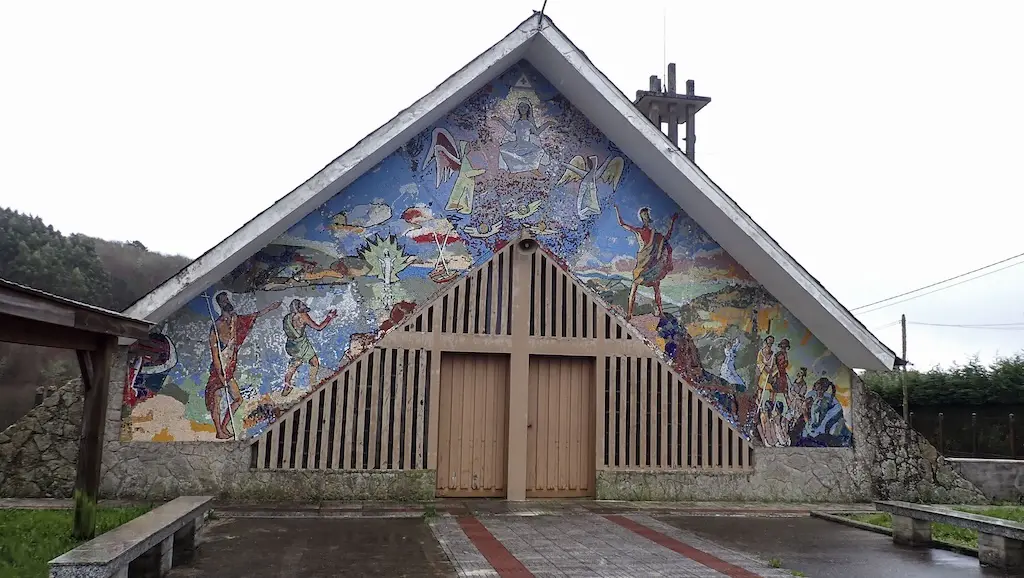 Logo de máis de hora e media de viaxe e de tomar un café en Cabreiros, o bus levounos ata a aldea de Lousada, punto de inicio e final da ruta. Hoxe imos poucos, supoño que debido ás previsións meteorolóxicas que non son boas, nesta vaga de temporais que estamos a ter neste inverno, a xente non se animou a vir, pero o día non estivo tan mal para camiñar. Reunímonos as quince persoas no adro da igrexa parroquial, unha construción moderna inaugurada en 1962, cun mosaico na fachada principal que chama a atención. Non sei a quen lle escoitou Víctor que en Lousada había un teixo milenario, que foi talado para sufragar en parte a construción da igrexa e o cemiterio.