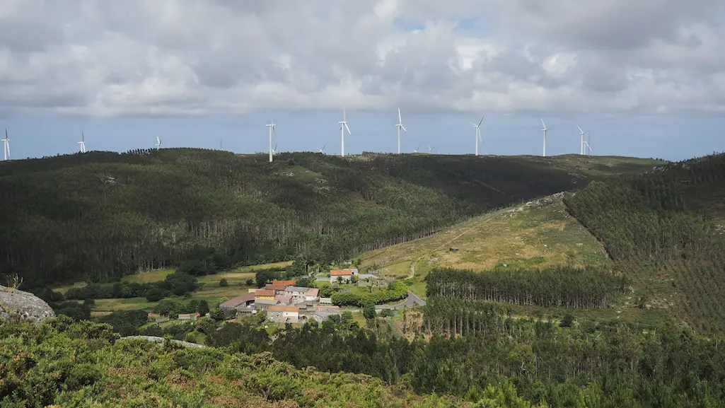 Antes de iniciar o descenso dirixímonos a un miradoiro natural ao pé dun eólico para gozar das vistas do val por onde viñemos camiñando e, continuando coa liña de aeroxeneradores, divisar os Montes da Ruña, por onde tamén temos feito algunha andaina, e máis ao fondo asoma o Barbanza, que se distingue pola instalación militar do Monte Iroite. Descendemos cara o val do Rego do Cadro, e cruzámolo para voltar polo camiño de ida ata a aldea de Lucín, e de aí dirixírmonos por estrada a Olveiroa.
