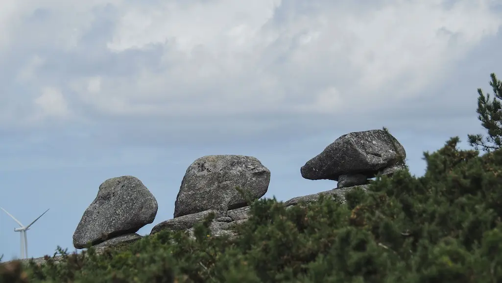 Tamén estamos diante das Tres Pedras, unha formación curiosa. Semella que hai algún carreiro para chegar onde elas, pois acertamos a ver algún fito, pero a vexetación impídenos facelo.