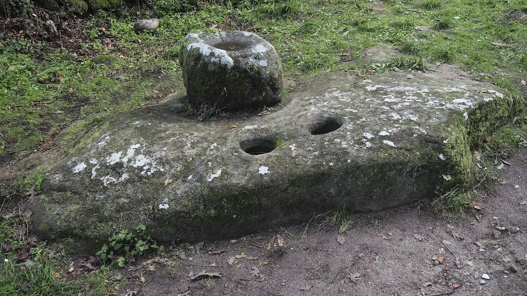 Saíndo do xacemento, penetrámonos na zona máis máxica e curiosa do percorrido. Aínda que estamos facendo o percorrido ao revés para explicar a lenda da Santa, agardo que se entenda o relato. Continuamos o carreiro ata chegar ao Carballo e as Pioucas da Santa, dúas fendeduras nas que a lenda conta que San Pedro aliviou as dores das queimaduras a Santa Mariña. En realidade, as estruturas das pioucas son un lagar rupestre ao estilo do Torcularium romano, unha prensa que, ao baixar, levaría por rebose o xugo extraído dun froito da pía máis grande á mais pequena.