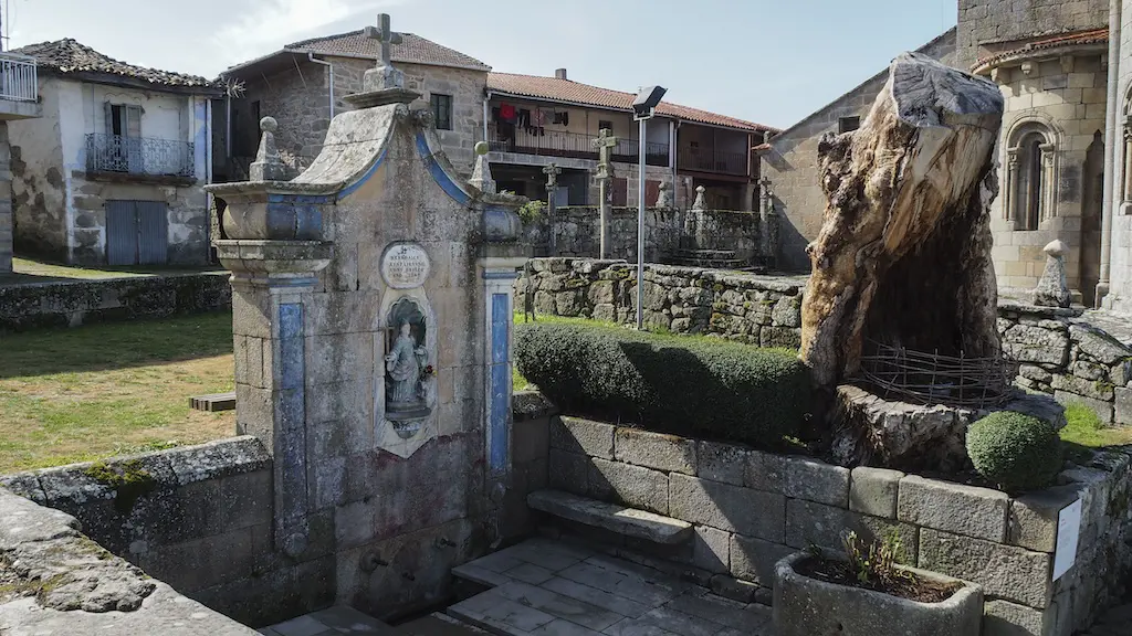 Continuamos cara á zona posterior do templo, onde accedemos á Fonte Santa, segunda das fontes da lenda. Dispón de tres canos de onde emana a auga milagrosa, e unha pequena canalización que verque nun lavadoiro. Facemos unha pequena parada para admirar o entorno e a armoniosa cabeceira de tres ábsidas da igrexa, sobre os que se abren tres rosetóns que iluminan o interior, e continuamos cara a segunda parte do percorrido.