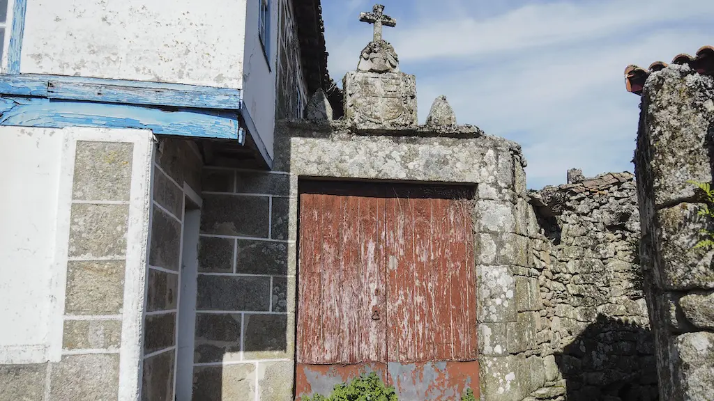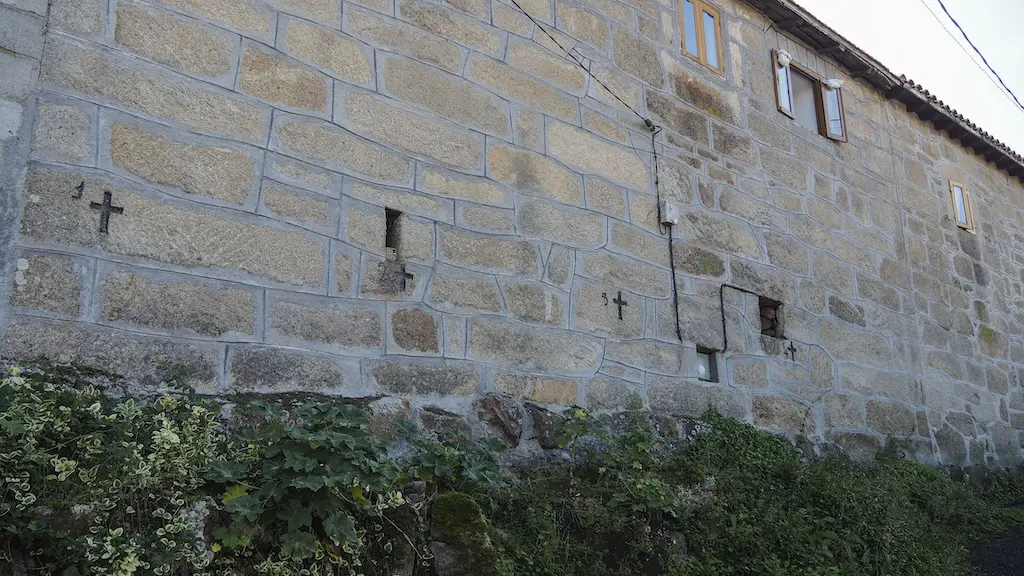 Logo desta forte subida, dirixímonos ata Os Casares, o núcleo máis grande dos tres polos que pasaremos, onde hai unha pequena concentración de hórreos e unha porta brasonada que chama a atención. Facemos unha parada para xantar antes de pasar por Areás, e continuamos a andaina en descenso por unha congostra estreita e profunda que nos deixa nun camiño encharcado antes de entrarmos na Lamela. Nesta última aldea chámanme moito a atención as inscricións de cruces numeradas gravadas nos muros dunha casa, a modo de Via Crucis (a verdade é que non cheguei a comprobar se había 14 estacións).